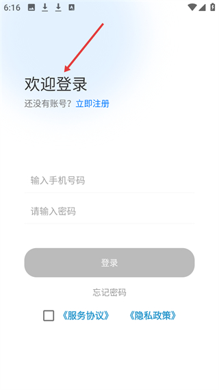 1、登錄界面,顯示歡迎登錄,可輸手機號和密碼登錄,未注冊可立即注冊,需勾選協議,有忘記密碼選項。
