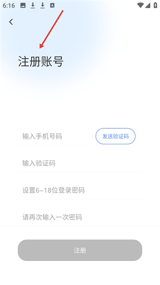 2、注冊界面,標題注冊賬號,需輸手機號、驗證碼,設置并確認密碼,完成后點擊注冊。