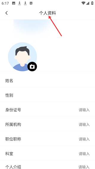 4、個人資料界面可編輯頭像、姓名、性別、身份證號、所屬機構、職位職稱、科室、個人介紹等信息,用于完善用戶個人信息。