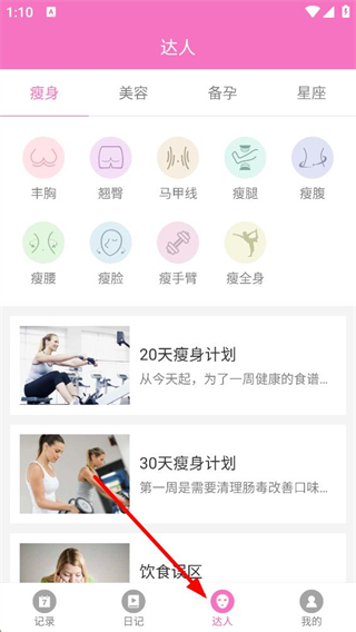 4、進入達人界面,可切換瘦身、美容等分類,選擇對應美體目標,查看如20天瘦身計劃等內容,獲取相關健康管理方案。