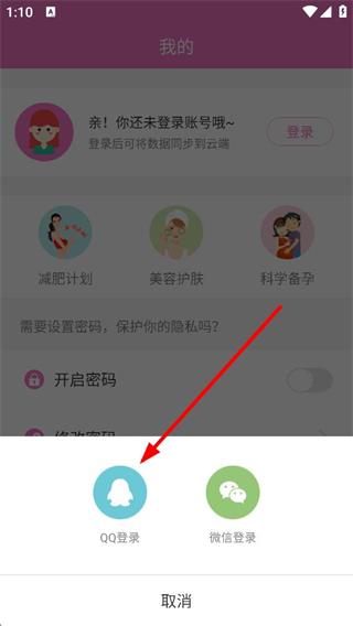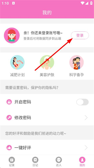 2、進入我的界面,未登錄時可點擊登錄按鈕,登錄后數據可同步至云端,還能使用減肥計劃、美容護膚等功能,也可設置密碼保護隱私。
