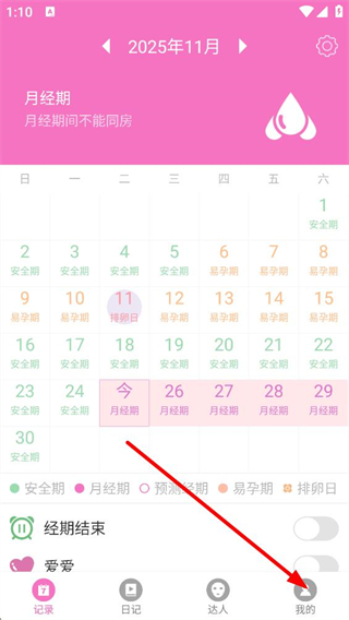 1、進入記錄界面的日歷頁,可查看2025年11月的經期狀態,包含安全期、易孕期等分類,還能標記經期結束、記錄相關行為,輔助管理生理周期。