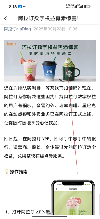 3、在活動詳情頁面閱讀內容了解可兌換的茶飲在線點餐服務,查看操作指南部分,獲取使用數字權益兌換服務的步驟信息。