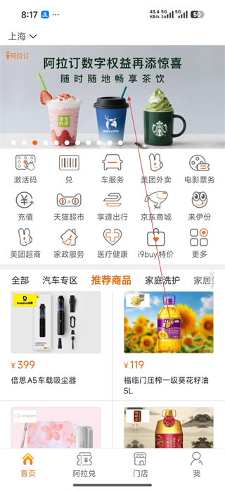 2、進入主界面后查看頁面中的推薦商品及各類服務入口,找到阿拉訂數字權益相關的活動內容并點擊,進入對應的活動詳情頁面。