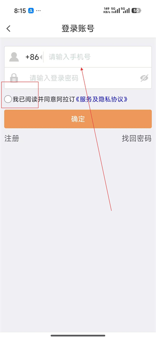 1、打開阿拉訂進入登錄賬號頁面,勾選我已閱讀并同意相關協議,輸入手機號和登錄密碼,點擊確定按鈕,可完成登錄進入軟件主界面。
