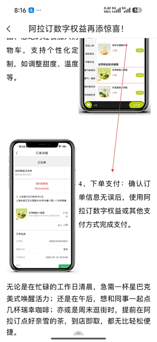 4、按照操作指南在軟件中選擇目標茶飲商品,調整個性化設置后確認訂單信息,使用阿拉訂數字權益完成支付,可享受對應的服務。