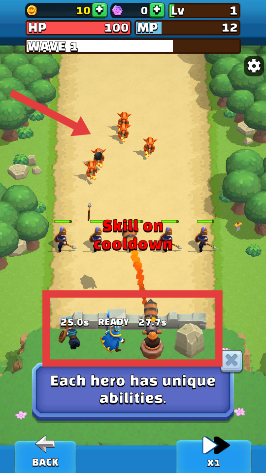 3、玩家進行戰斗戰斗中敵人會分波次進攻,玩家需把握技能釋放時機,合理運用英雄技能和防御設施,抵御敵人進攻,守護城堡。