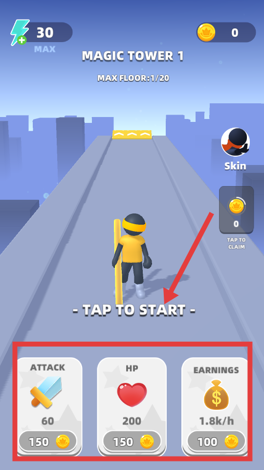 1、進入游戲界面別著急點TAP TO START,金幣夠的話優先升級攻擊和血量,攻擊高打怪快、血量厚扛揍,收益升級也能讓金幣積累更高效,強化后再出發戰斗會輕松些。