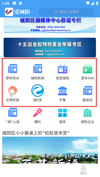 1、首頁,設有即時熱點、城陽新聞等功能入口,涵蓋本地資訊與服務板塊,是獲取城陽區域信息的核心操作界面。