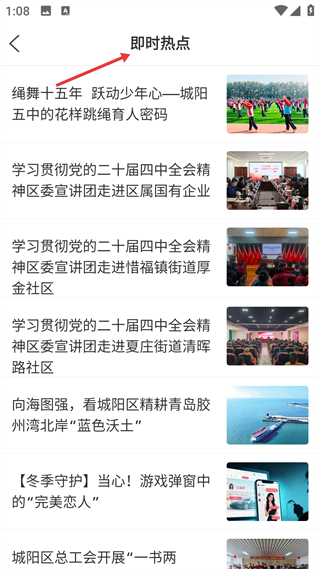2、即時熱點頁面,呈現城陽本地各類熱點資訊,包含活動、政策宣講等內容,幫助用戶及時了解區域最新動態。