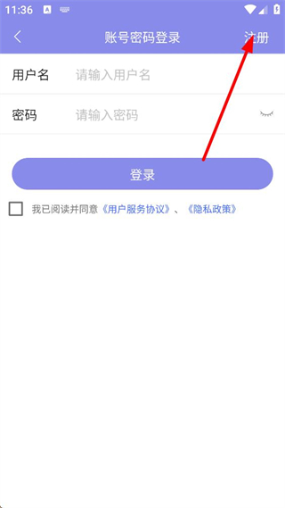 3、進入賬號密碼登錄頁面,有用戶名和密碼輸入框,右上角有注冊按鈕,勾選協議后點擊登錄可完成賬號登錄。