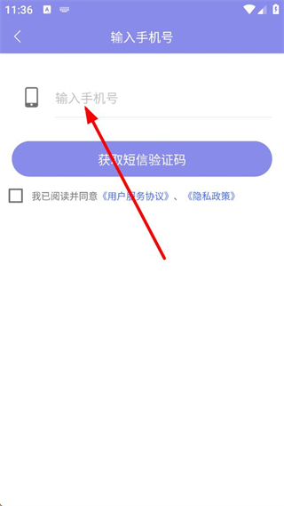2、進入輸入手機號頁面,設有輸入手機號的輸入框,還有獲取短信驗證碼按鈕,需勾選協議才能進行后續操作。