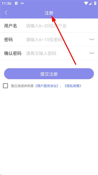 4、進入注冊頁面,需填用戶名、密碼并確認,勾選協議后點擊提交注冊完成賬號注冊。