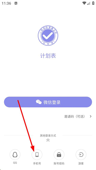1、進入計劃表頁面,能看到微信登錄按鈕及邀請碼選項,下方配備QQ手機號等登錄方式,點擊手機號進入對應登錄頁面。