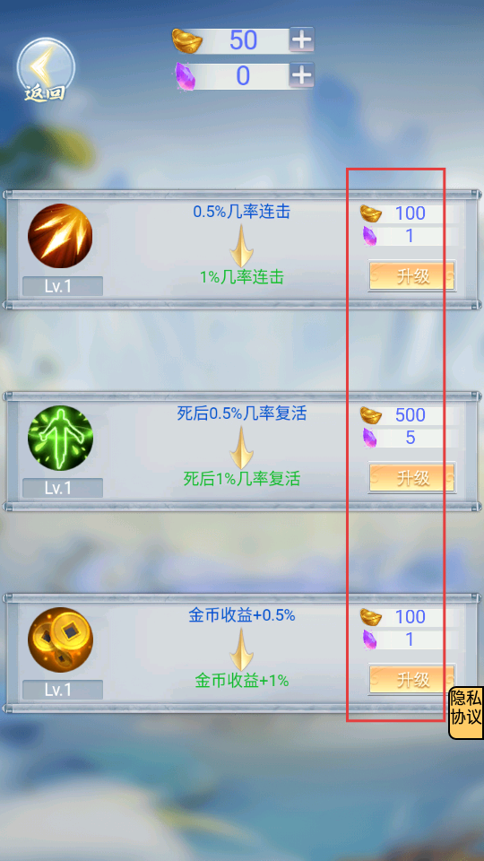 1、先來到能力升級界面,這里有連擊、復活、金幣收益等不同能力升級選項,根據自身游戲策略,選擇合適的能力進行升級,能為后續闖關打好基礎。