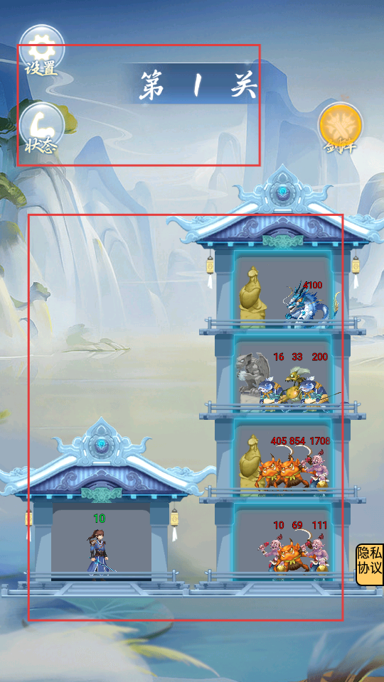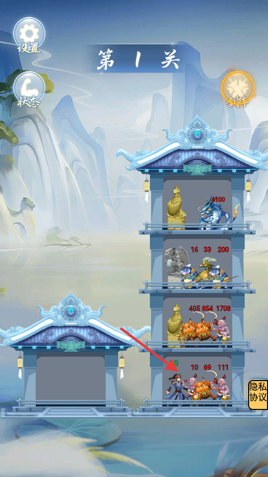 3、進入第一關后呈現出帶有中式建筑風格的關卡場景,有多層的建筑結構,每層分布著不同的怪物,怪物旁標注著數值,上方有設置、狀態等功能按鈕。