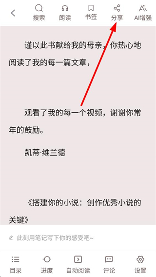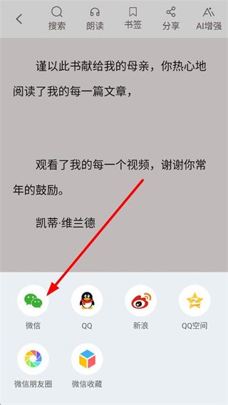 3、進入書籍閱讀界面,找到頂部功能欄中的分享按鈕,點擊該按鈕,即可調出包含多種分享渠道的選項彈窗。
