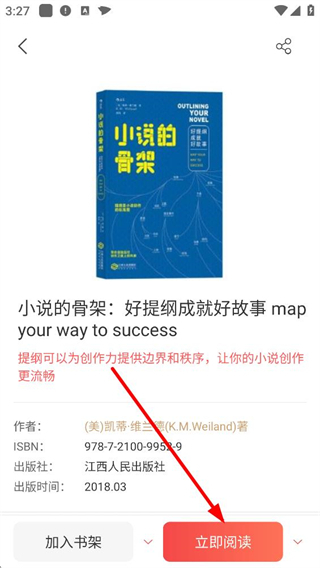 2、進入小說的骨架詳情頁,查看作者、出版社等信息后,點擊立即閱讀按鈕,就能進入書籍的閱讀界面。