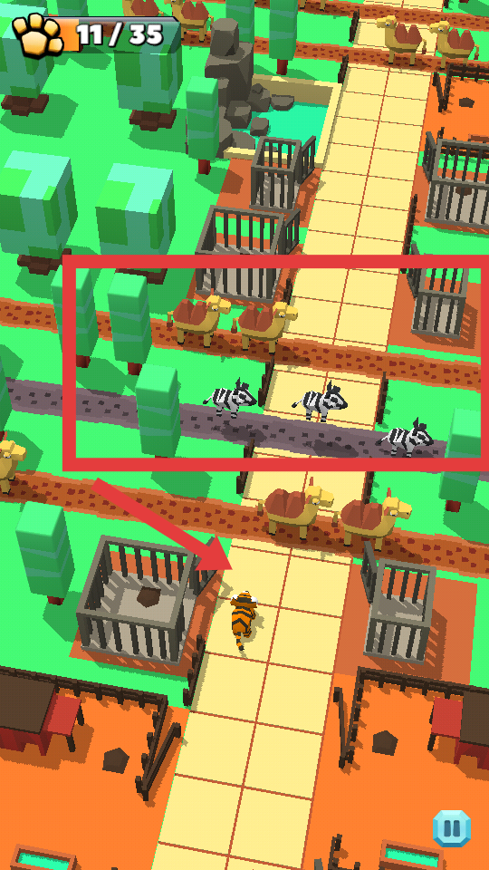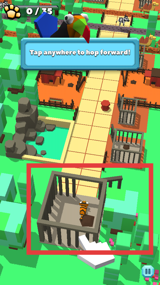 1、游戲開始后點擊屏幕任意位置,可讓籠子里的動物如老虎向前跳躍移動,以此在動物園場景的道路上前進,逃離初始區域。
