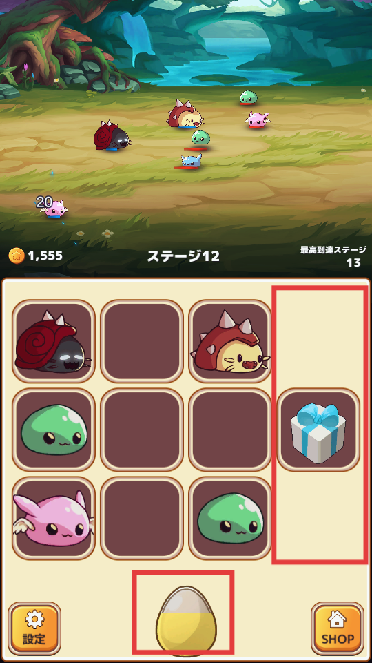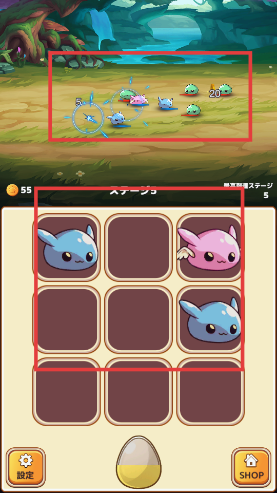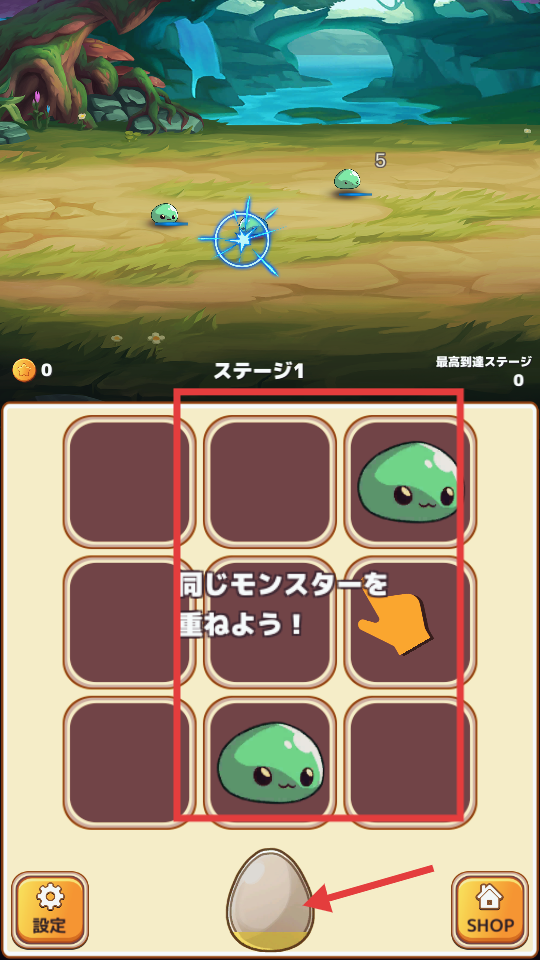 2、隨著游戲推進會孵化出更多種類的怪獸,在方格區域把相同種類的怪獸放在一觸發融合,融合后的怪獸會到上方場景與更多敵人戰斗,擊敗敵人可獲得金幣等獎勵。