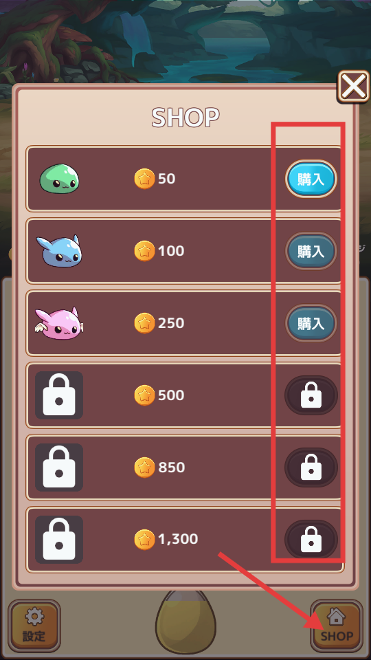 3、點擊界面的SHOP按鈕進入商店界面,這里列出了不同種類的怪獸,每種怪獸需要消耗相應數量的金幣才能購買,購買后可獲得新的怪獸,用于方格區域的融合。