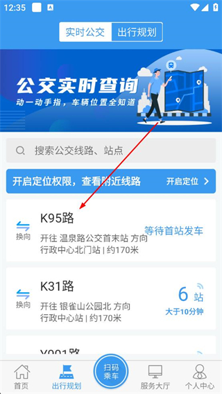 2、在公交列表中選擇K95路開往溫泉路公交末站方向的,點擊進入該線路的詳情頁面。