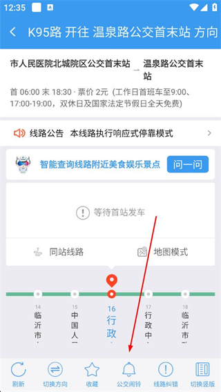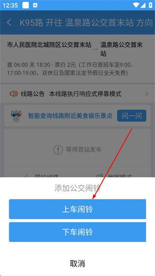 3、在K95路詳情頁查看運營時間及站點信息,點擊公交鬧鈴按鈕,彈出添加公交鬧鈴的選項窗口。