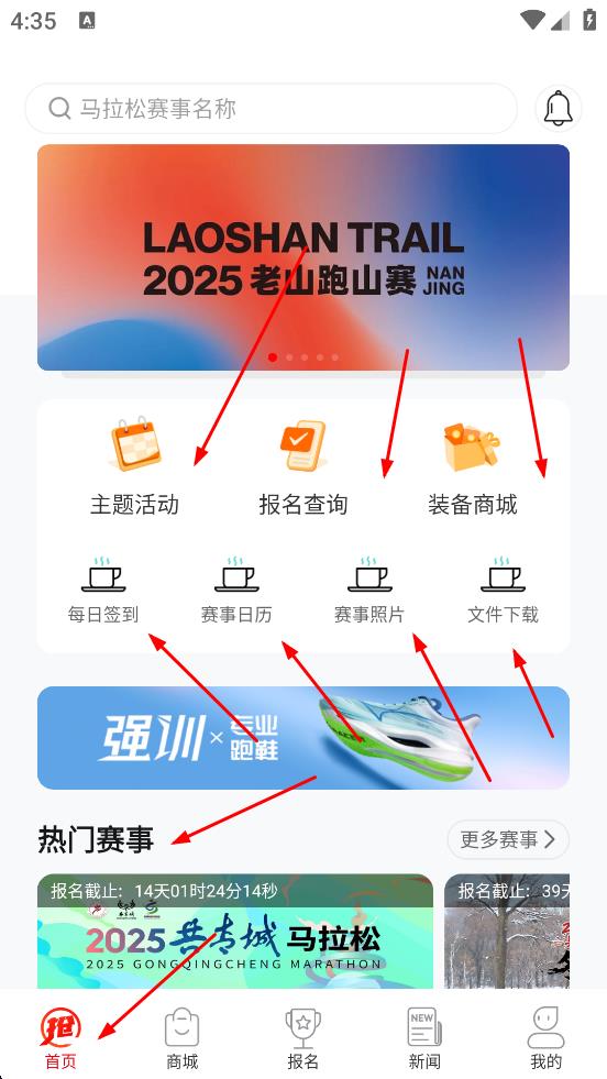 1、首頁搜索賽事,點主題活動等功能了解賽事,從熱門賽事找感興趣的馬拉松報名參與。
