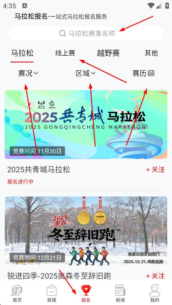 2、報名頁選賽事類型,用賽況區域篩選,查賽歷找合適賽事,關注后及時報名不錯過。
