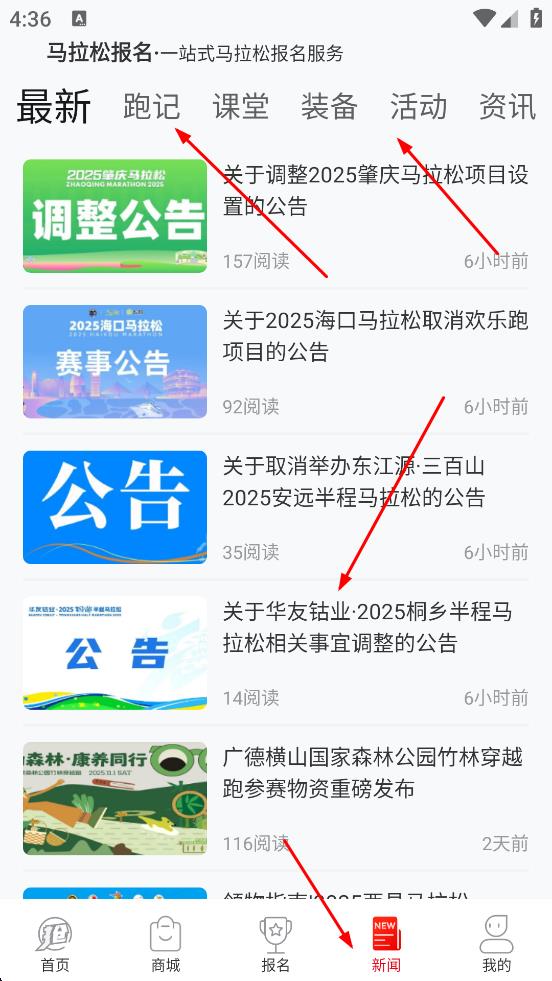 3、點擊新聞頁面聚合跑記、課堂等資訊,發布賽事領物須知、賽程調整等公告,更新賽事動態。