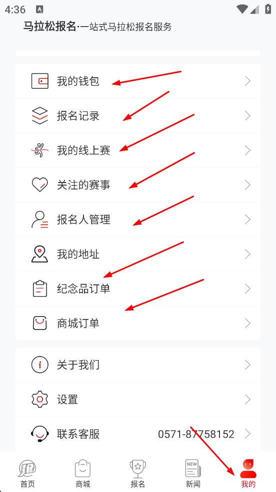 4、我的頁管理錢包訂單,查報名記錄線上賽,設置地址關注賽事,方便馬拉松參賽操作。
