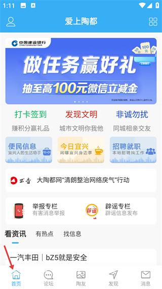 1、首頁有建行建易貸廣告,還有打卡簽到、發現文明等多種功能入口,以及便民信息、今日宜興等板塊。