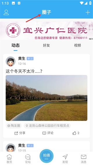3、切換到圈子界面,能查看用戶發布的動態內容,切換好友視頻分類,還可點擊拍攝按鈕分享自己的內容,進行互動交流。