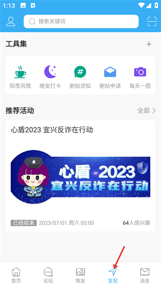 4、進入發現界面,可使用工具集里的陽羨風情等功能,查看推薦活動,了解已結束或進行中的主題活動相關信息。