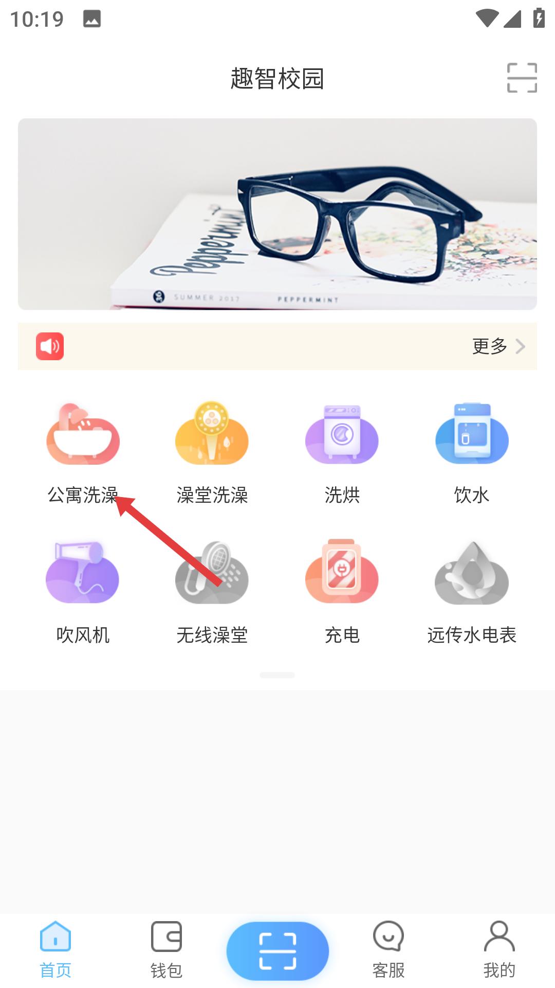 1、在趣智校園首頁,若需使用公寓洗澡服務,可點擊公寓洗澡選項,進入公寓洗澡服務頁面。