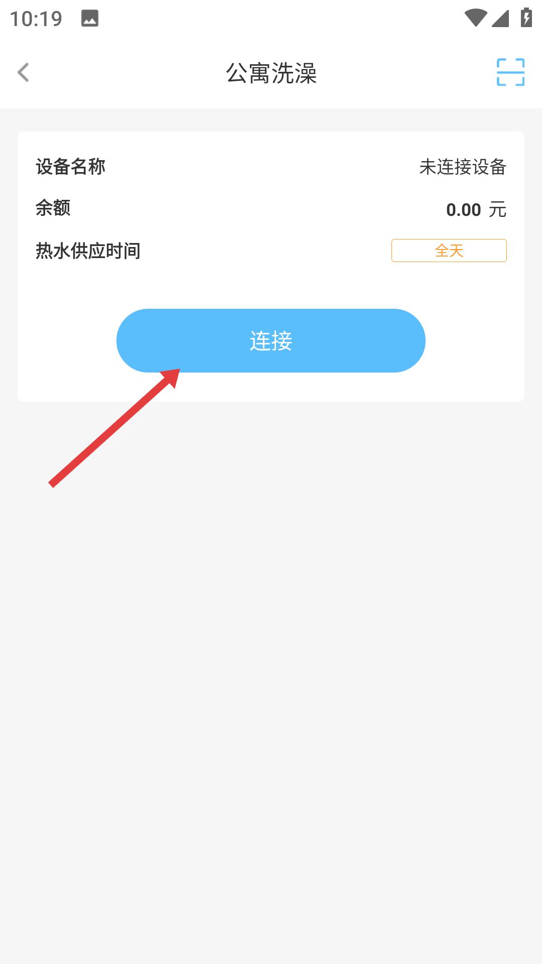 2、進入公寓洗澡服務頁面后,可查看設備名稱、余額及熱水供應時間,點擊連接按鈕可開始連接設備。