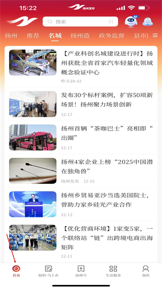 1、進入首頁板塊,可查看揚州本地的多元資訊,涵蓋產業科創建設場景創新動態茶咖巴士亮相等內容,及時獲取本地發展與民生相關的最新信息。