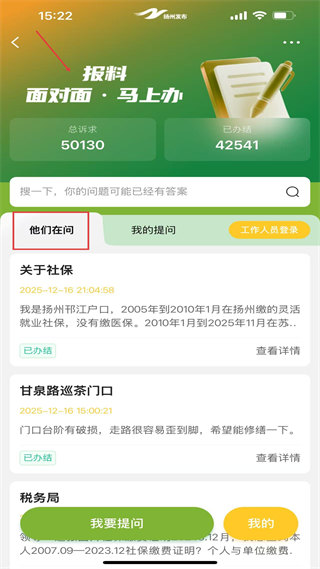 2、切換到報料-馬上辦板塊,能查看他人提交的各類訴求及已辦結案例,也可點擊我要提問按鈕,提交自身的問題或訴求,獲取對應的政務服務支持。