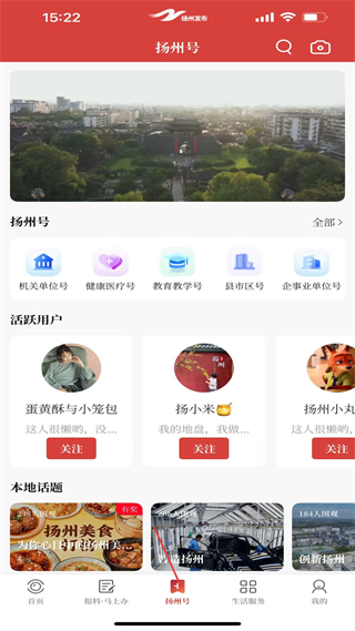 3、進入揚州號板塊,可選擇機關單位號健康醫療號等不同類別賬號,關注活躍用戶,參與本地話題互動,拓展本地相關的社交與資訊獲取渠道。
