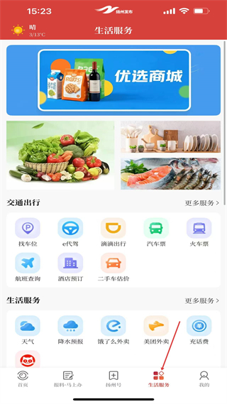 4、切換到生活服務板塊,可使用優選商城功能,還能借助交通出行生活服務類工具,獲取找車位外賣充值等本地生活相關的各類便捷服務。