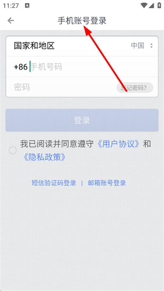 3、選擇手機賬號登錄,需選擇國家和地區,輸入手機號碼、密碼,若忘記密碼可點擊找回,勾選同意用戶協議和隱私政策后登錄,適合習慣密碼登錄的用戶。