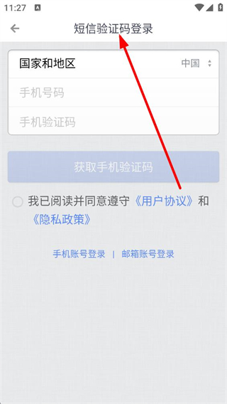 2、選擇短信驗證碼登錄,需選擇國家和地區,輸入手機號碼、手機驗證碼,獲取驗證碼并勾選同意用戶協議和隱私政策后即可登錄,方便快捷。