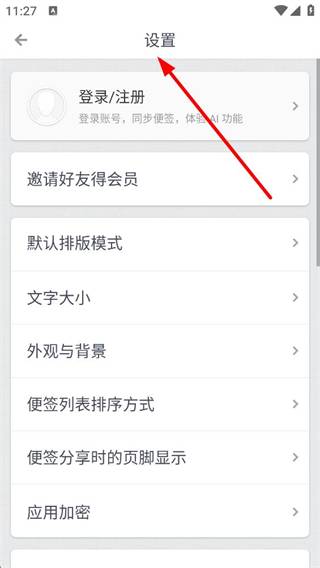 1、進入設置界面,可進行登錄、注冊、邀請好友得會員、設置默認排版模式、調整文字大小、設置外觀與背景、選擇便簽列表排序方式。