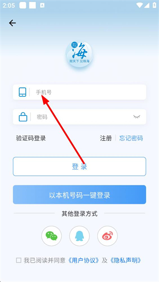 3、登錄界面,可選擇手機號密碼登錄,也可選擇驗證碼登錄、以本機號碼一鍵登錄,還支持微信、QQ、微博等其他登錄方式,登錄前需同意用戶協議及隱私聲明。