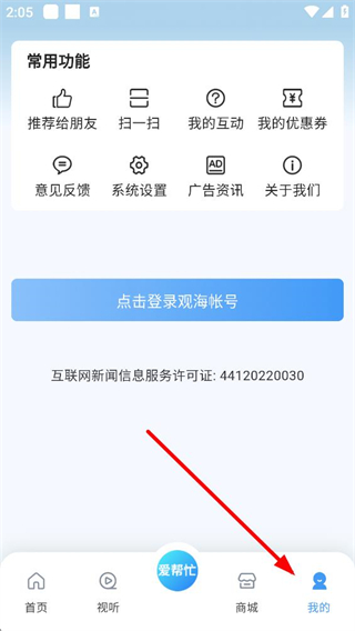 2、點擊底部我的,進入個人中心,有常用功能如推薦朋友、掃一掃等,還有意見反饋、系統設置等選項,需登錄觀海帳號才能使用更多功能。