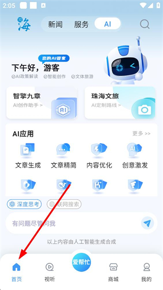 1、進入觀海APP首頁,可切換新聞、服務、AI板塊,AI板塊有智擎九章、珠海文旅等功能,AI應用包含文章生成、精簡等多種工具,還可直接提問互動。
