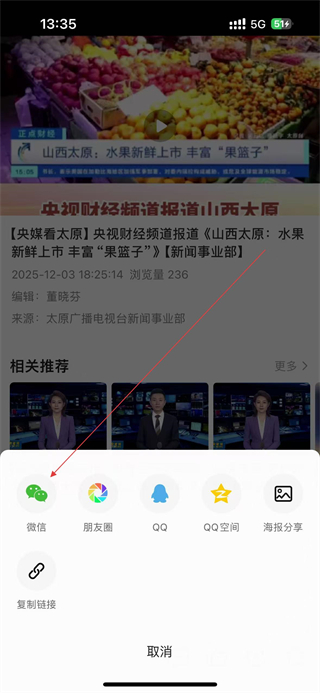 4、在分享彈窗中選擇想要的分享方式,如微信朋友圈等,按照提示完成,可將該資訊內容分享出去。