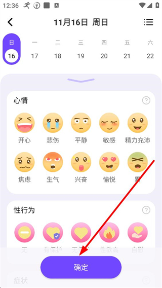 3、記錄界面,可選擇當天的心情狀態,如開心、悲傷等,還能記錄性行為情況,選擇完成后點擊確定保存記錄。