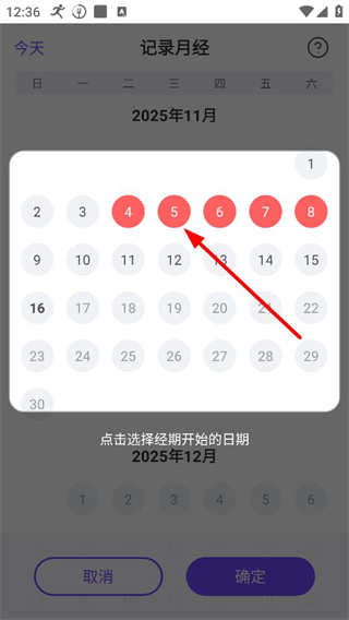 2、點擊記錄月經,可日歷中選擇經期開始的日期,選定后點擊確定即可完成經期開始時間的記錄。