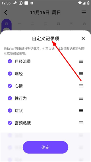 4、可進入自定義記錄項界面,對月經流量、痛經、心情等記錄項進行顯示或隱藏的設置,也可拖動調整記錄項的排列順序。